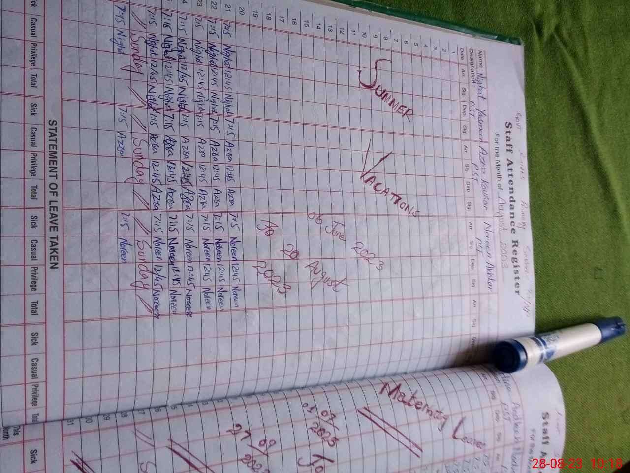 | Leave | Duty | Absent | Maternity | Medical | Ex- Pak |