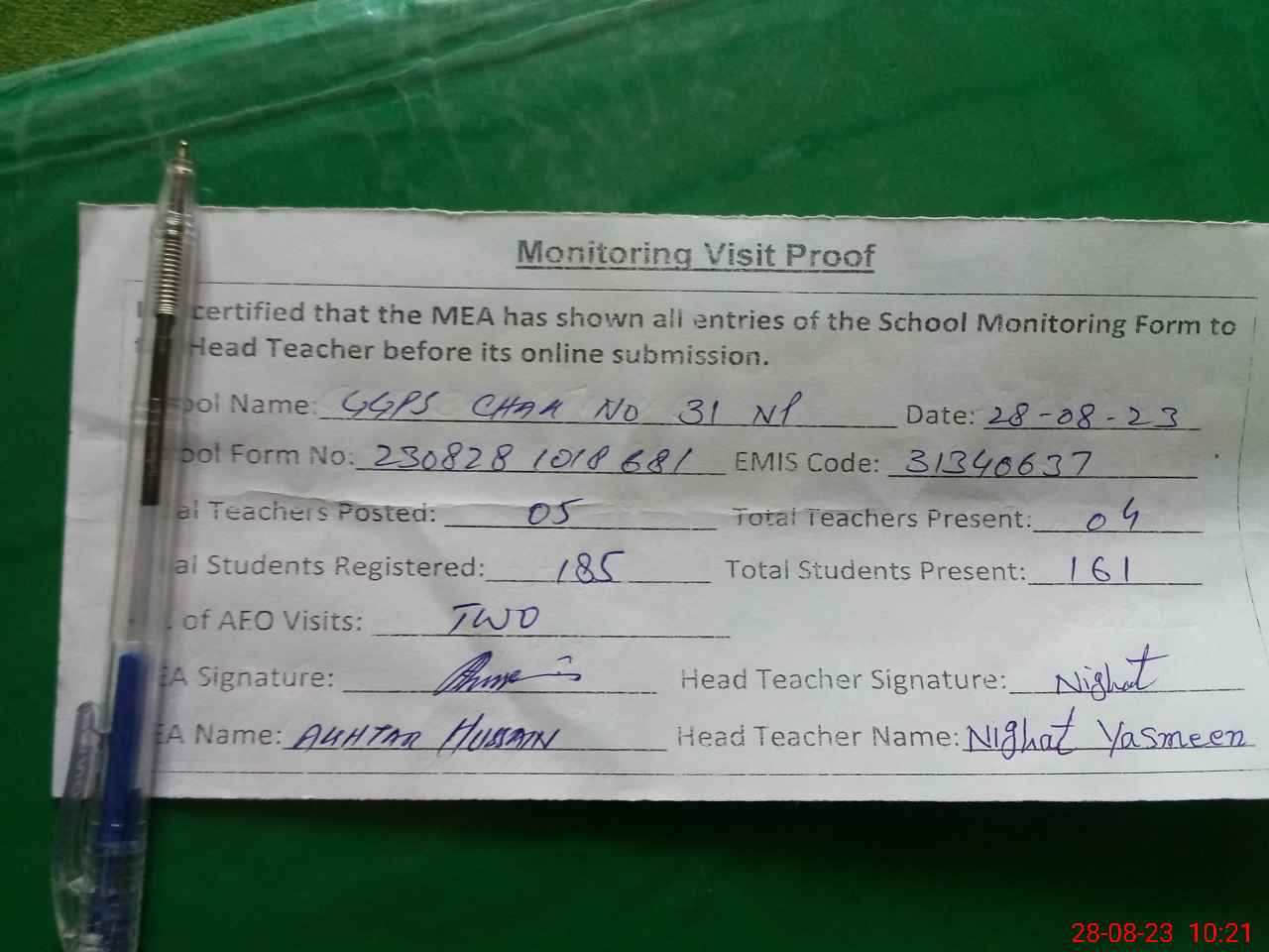 | Attendance Register | Head Teacher | MEA with School | Visit Proof |