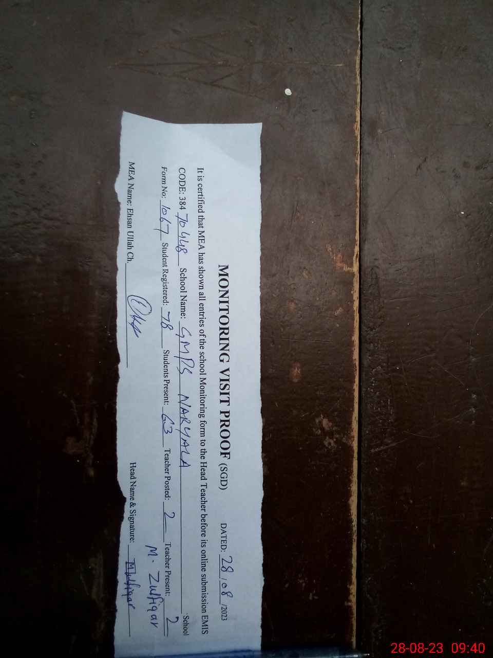 | Attendance Register | Head Teacher | MEA with School | Visit Proof |