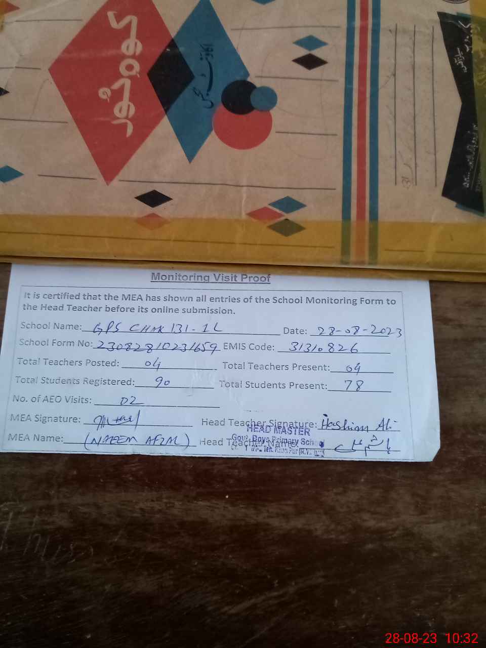 | Attendance Register | Head Teacher | MEA with School | Visit Proof |