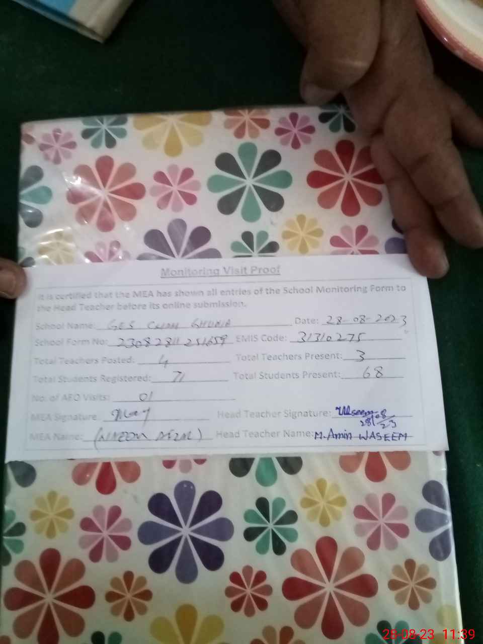 | Attendance Register | Head Teacher | MEA with School | Visit Proof |