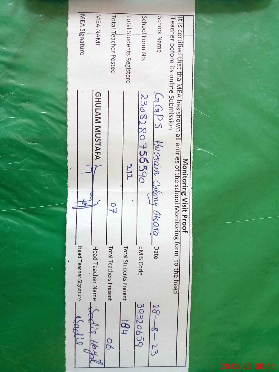 | Attendance Register | Head Teacher | MEA with School | Visit Proof |