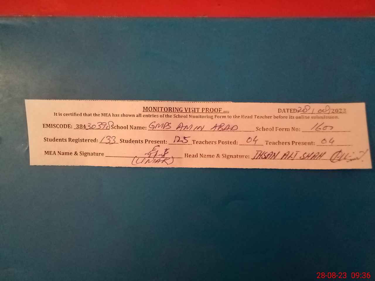 | Attendance Register | Head Teacher | MEA with School | Visit Proof |
