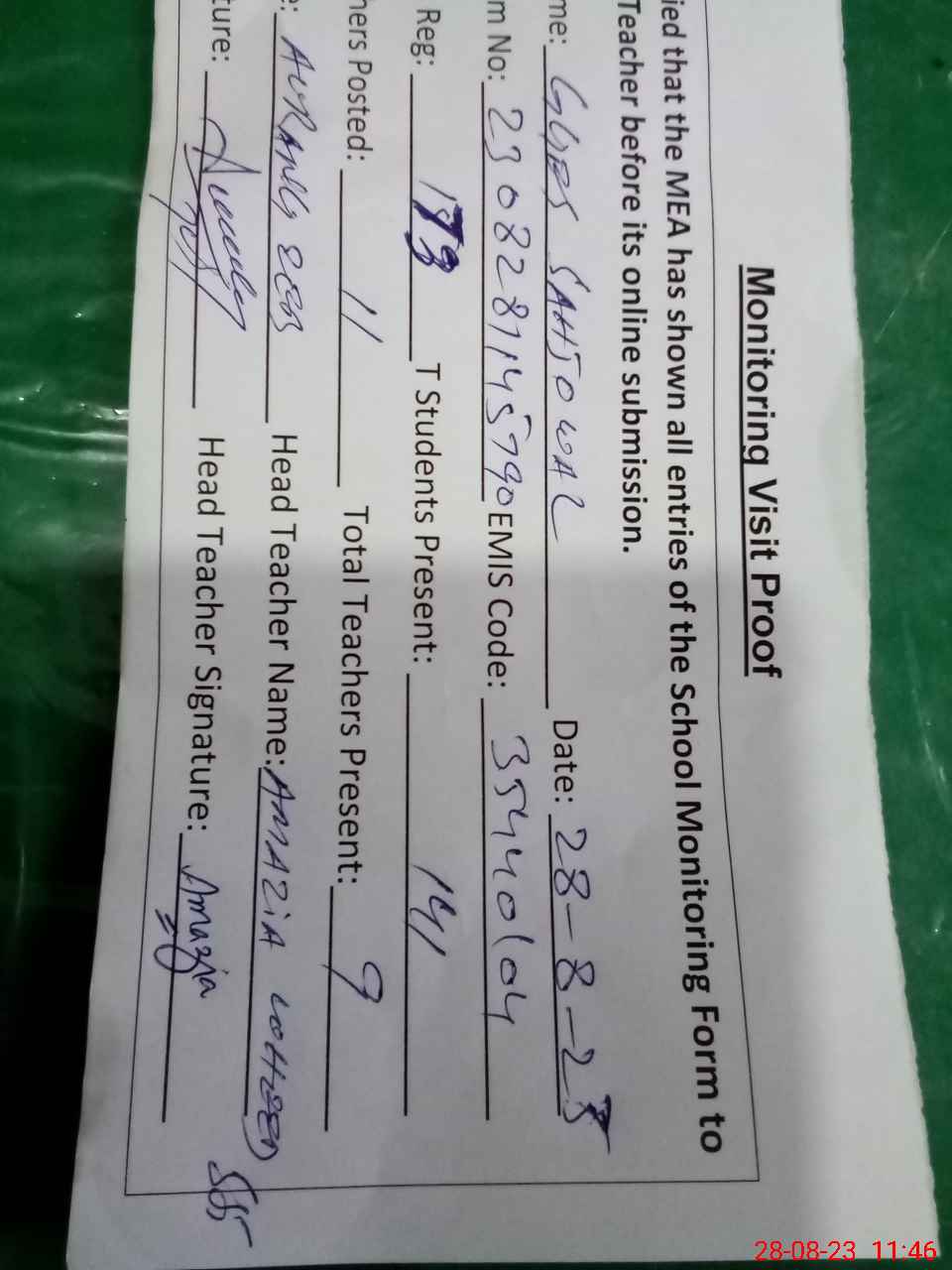 | Attendance Register | Head Teacher | MEA with School | Visit Proof |