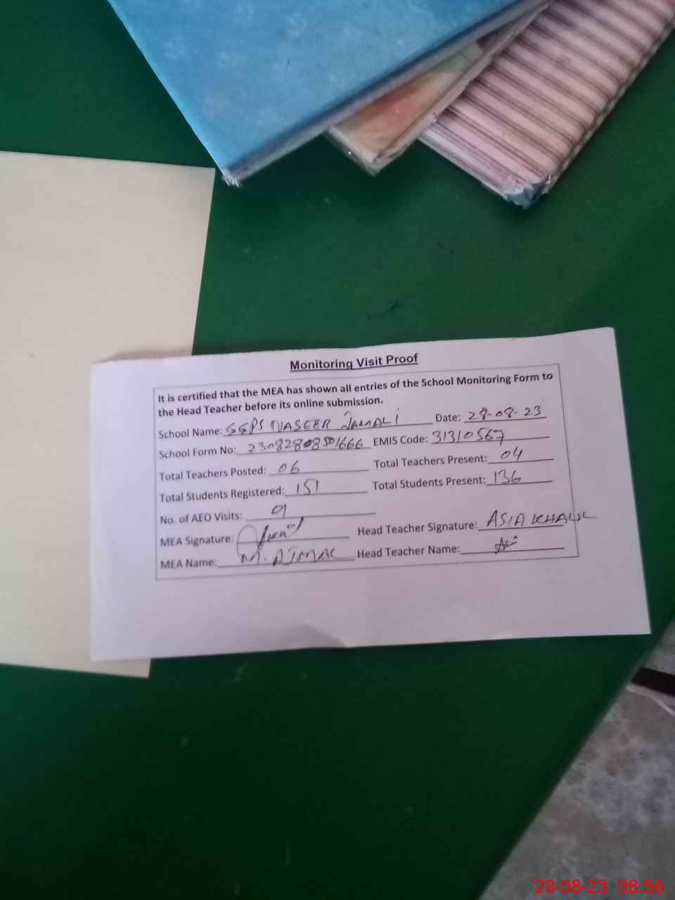 | Attendance Register | Head Teacher | MEA with School | Visit Proof |