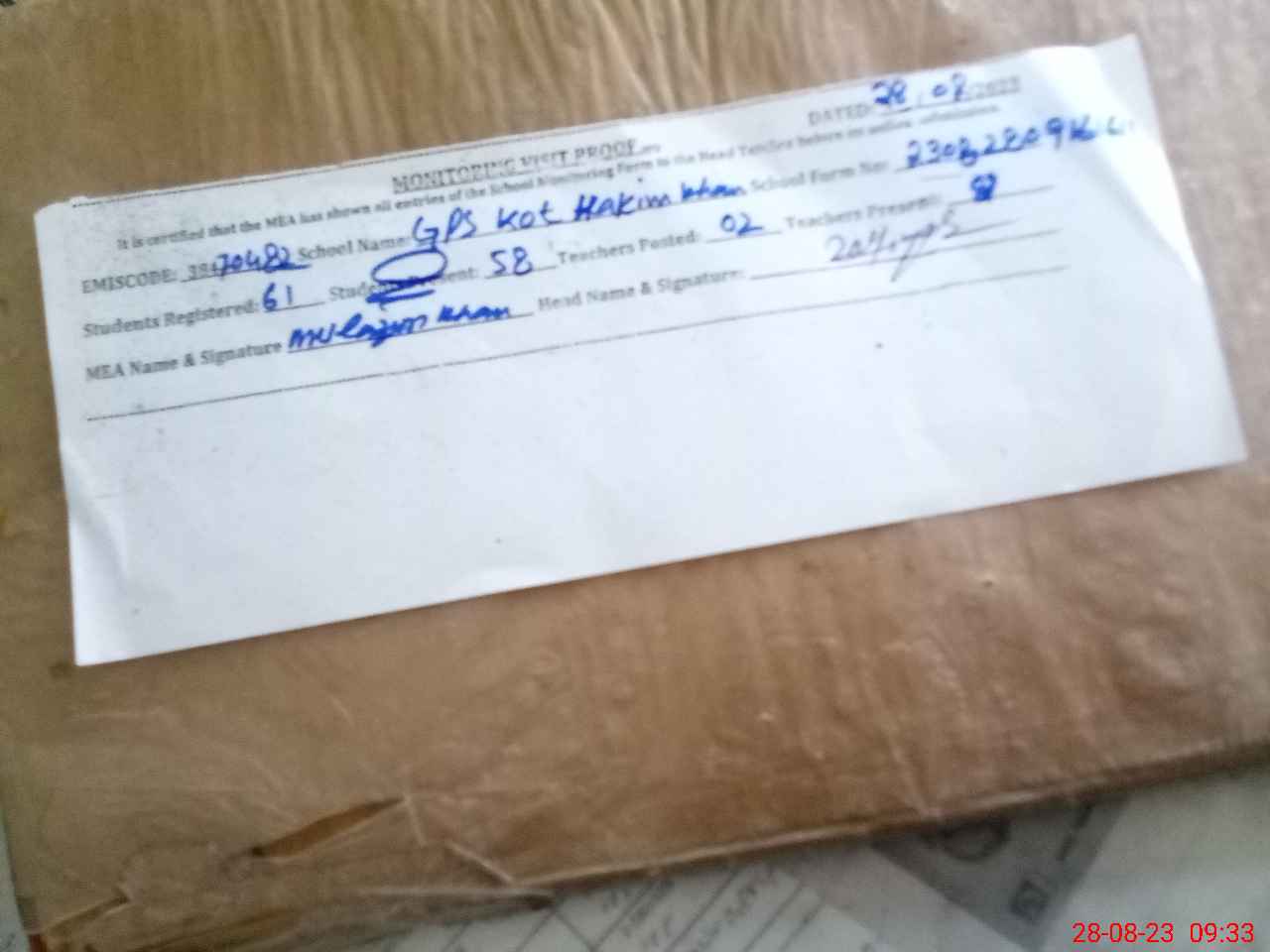 | Attendance Register | Head Teacher | MEA with School | Visit Proof |