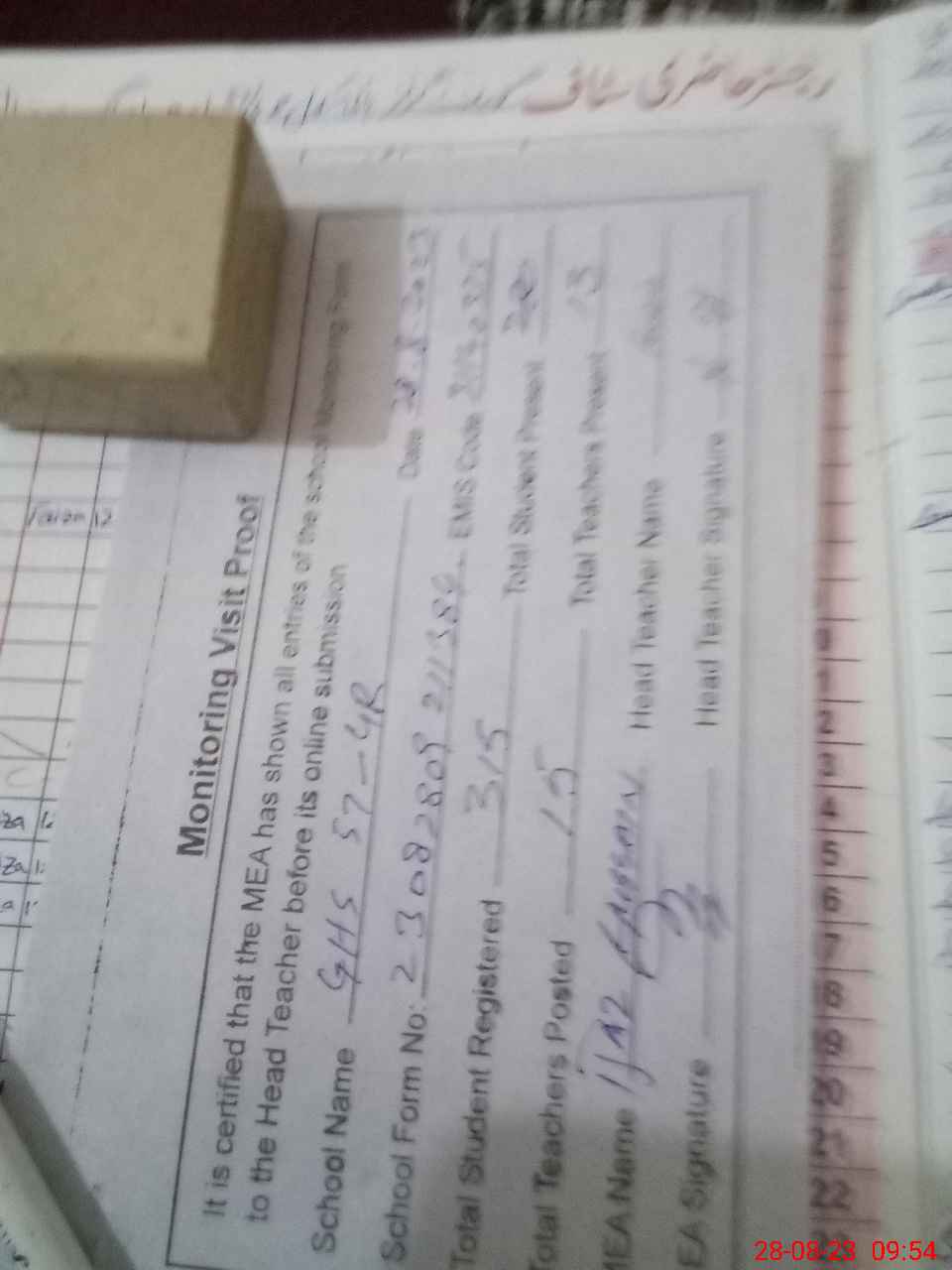 | Attendance Register | Head Teacher | MEA with School | Visit Proof |
