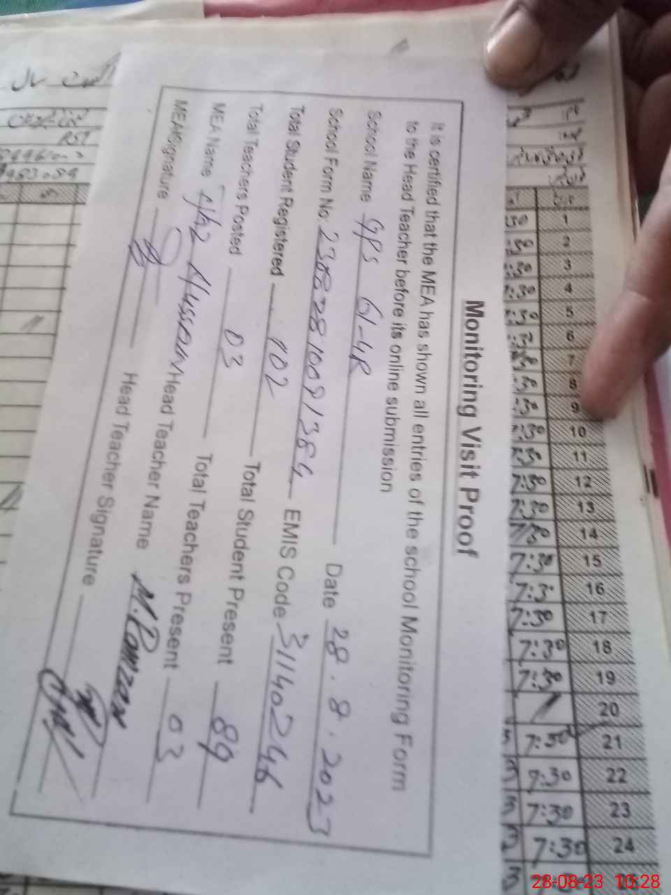 | Attendance Register | Head Teacher | MEA with School | Visit Proof |