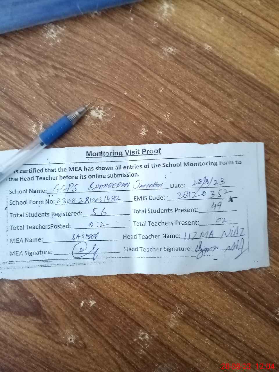 | Attendance Register | Head Teacher | MEA with School | Visit Proof |