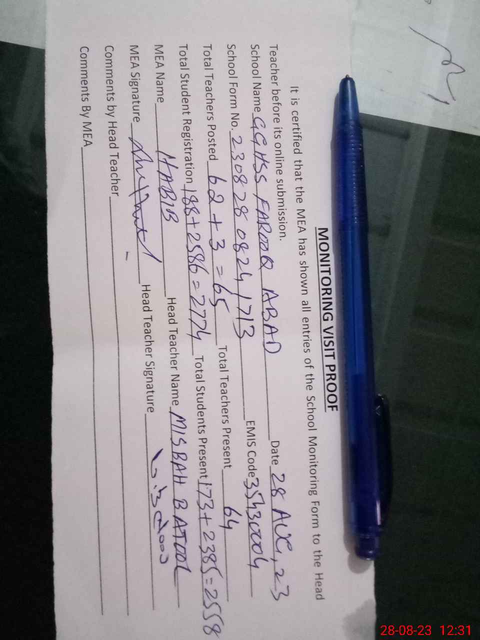 | Attendance Register | Head Teacher | MEA with School | Visit Proof |