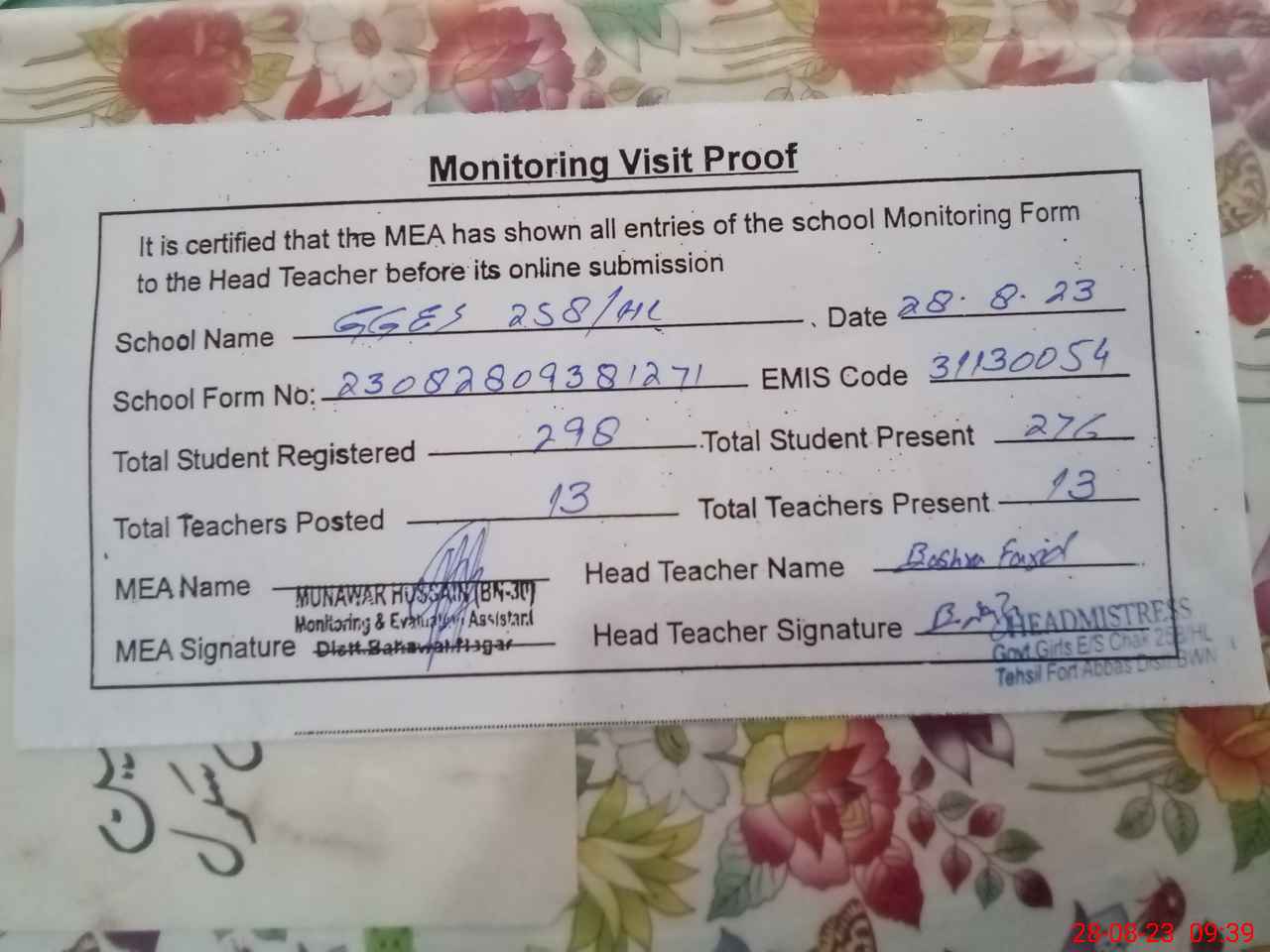 | Attendance Register | Head Teacher | MEA with School | Visit Proof |