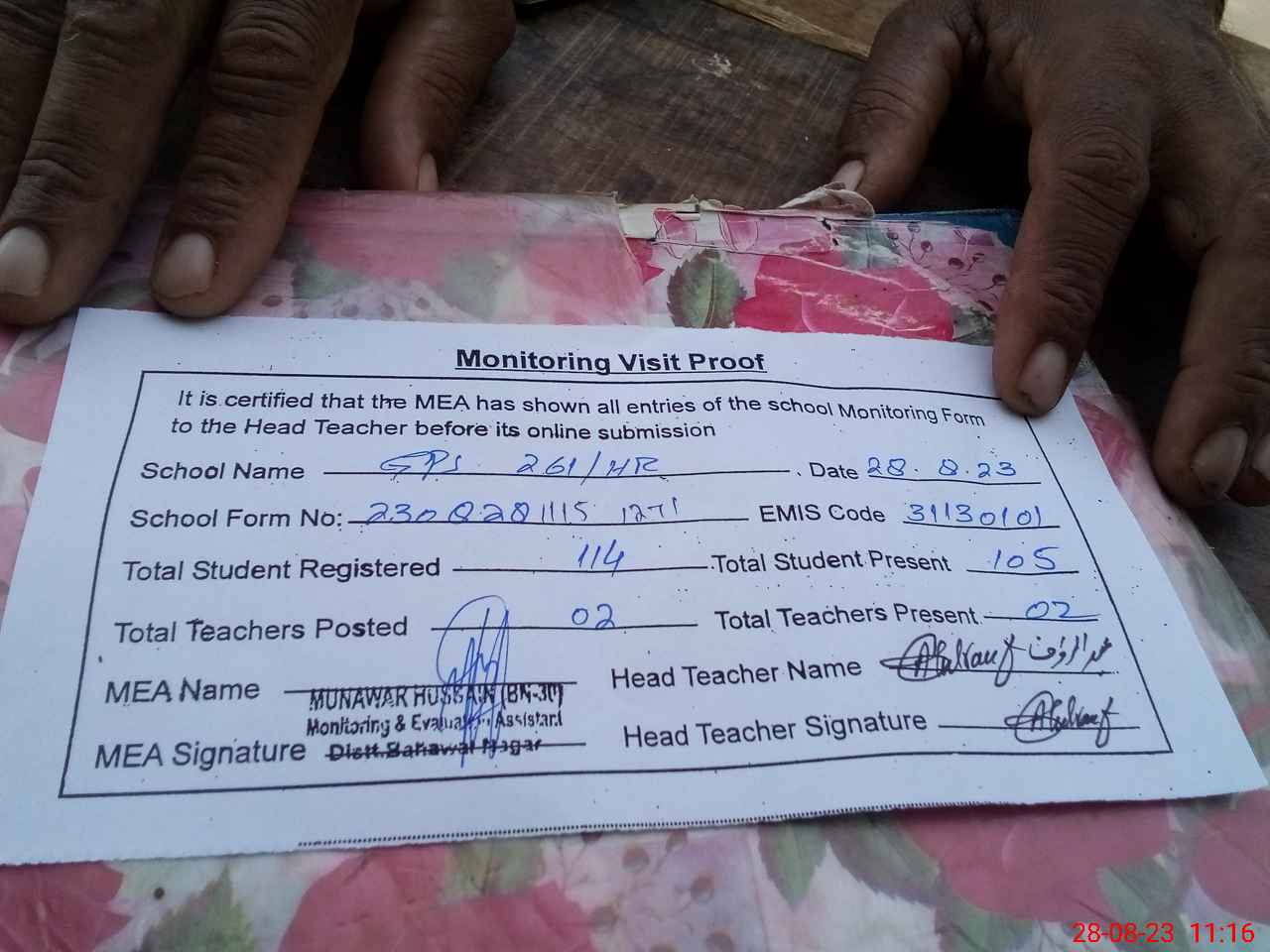 | Attendance Register | Head Teacher | MEA with School | Visit Proof |