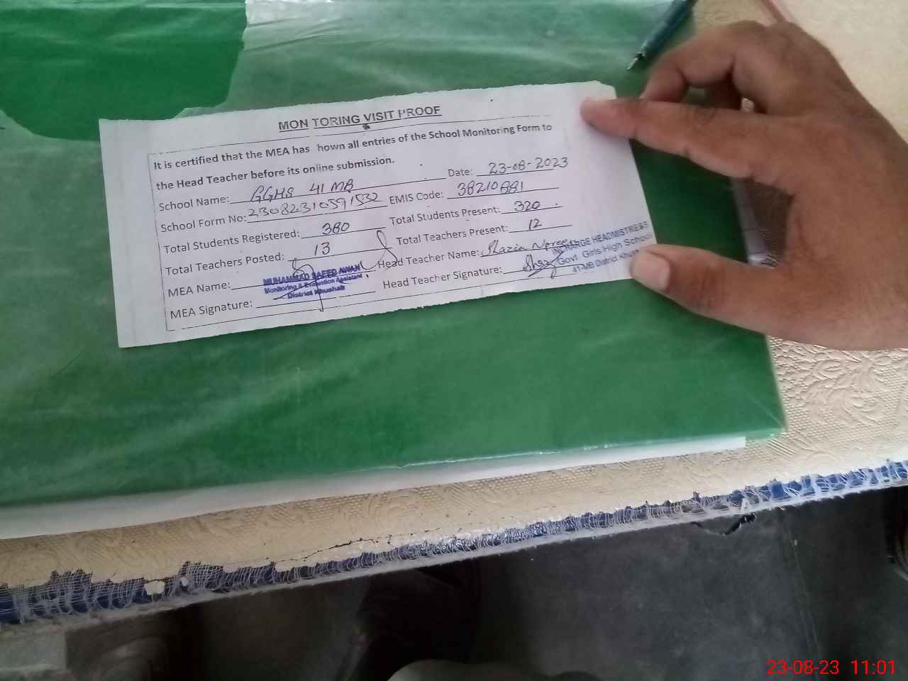| Attendance Register | Head Teacher | MEA with School | Visit Proof |