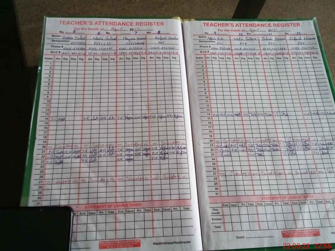 | CNIC | Full Name | Designation | R/C | Absence During Last Calender Month |