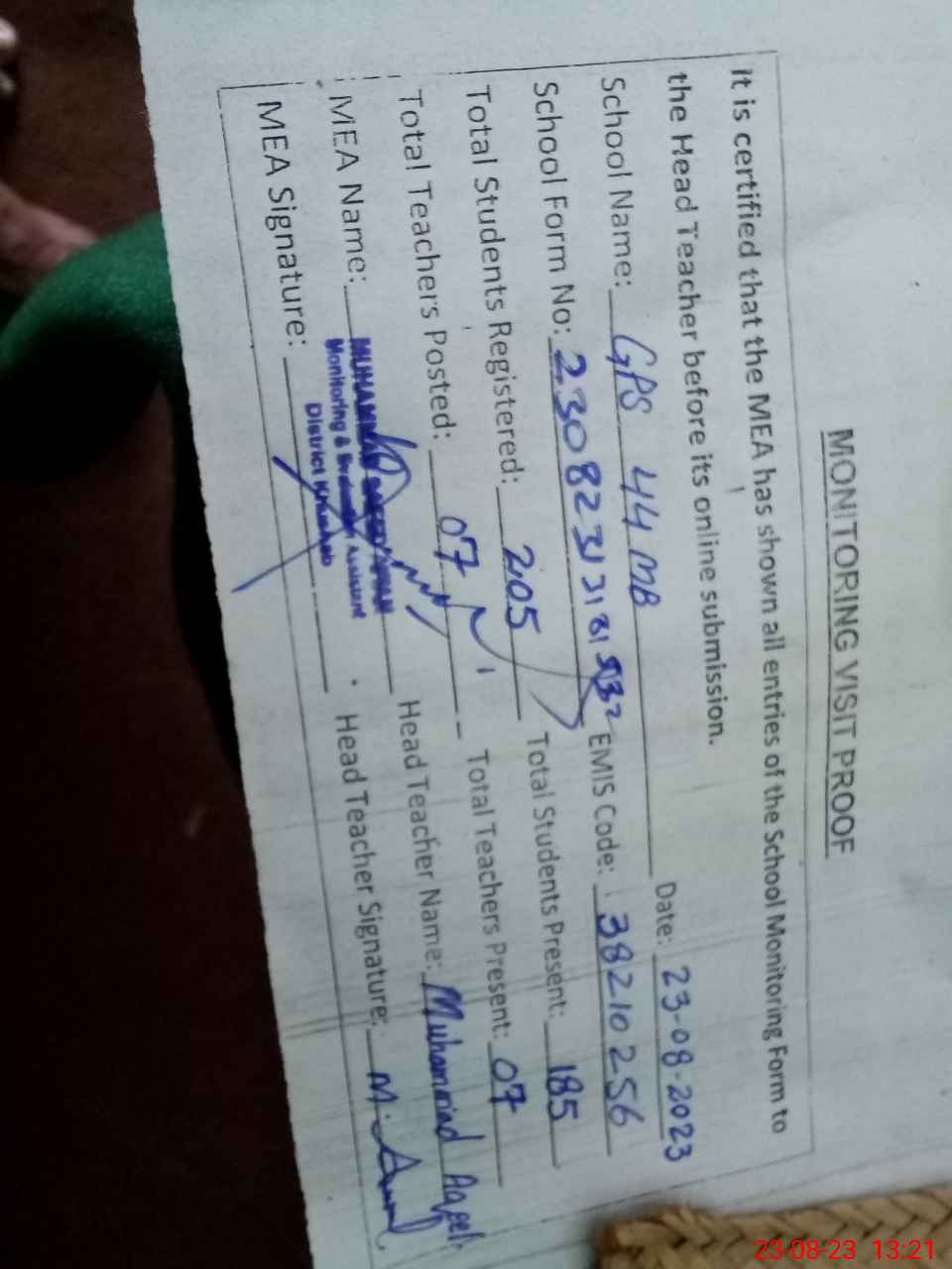 | Name: MU**** AQ**** Designation: (School Headmaster's/Headmistress's) PST Phone/Cell Number: 03**** |