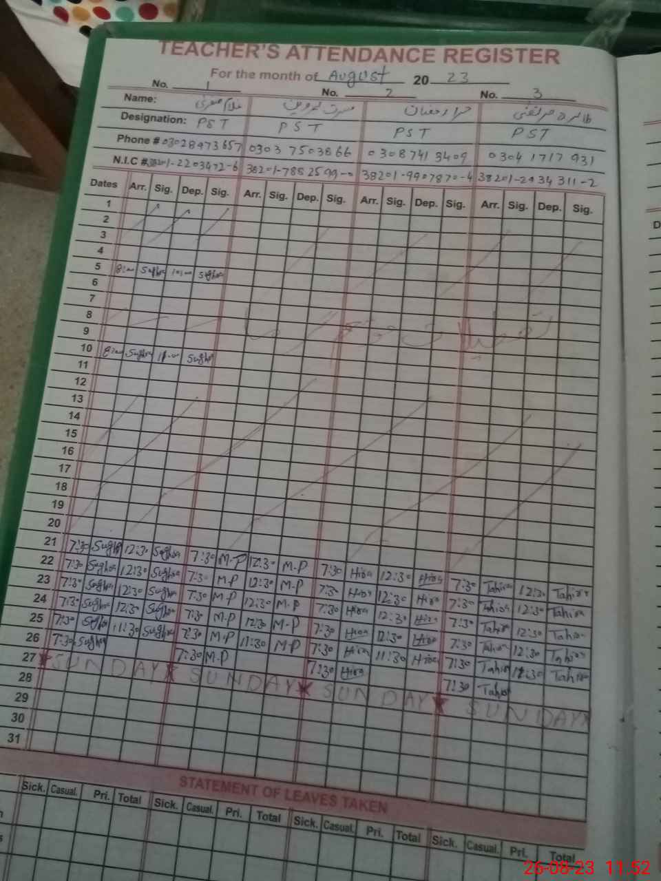 | CNIC | Full Name | Designation | R/C | Absence during last cal. month |