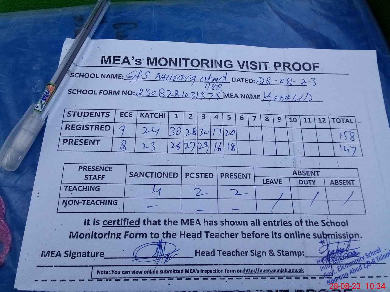 | Attendance Register | Head Teacher | MEA with School | Visit Proof |