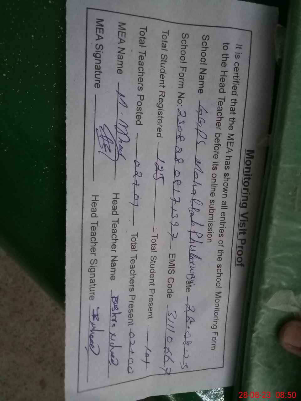 | Attendance Register | Head Teacher | MEA with School | Visit Proof |