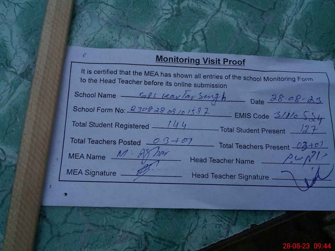 | Attendance Register | Head Teacher | MEA with School | Visit Proof |