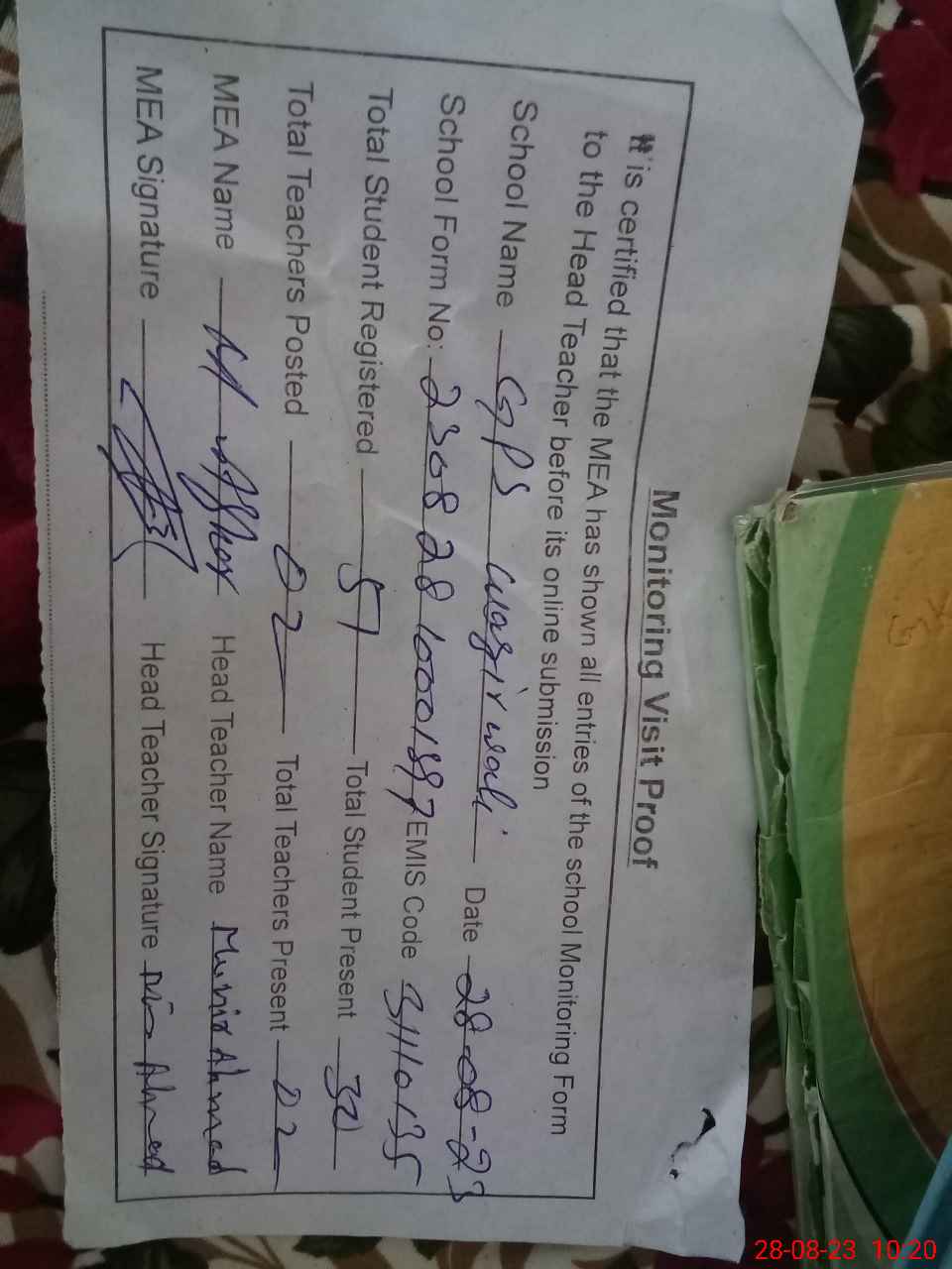 | Attendance Register | Head Teacher | MEA with School | Visit Proof |