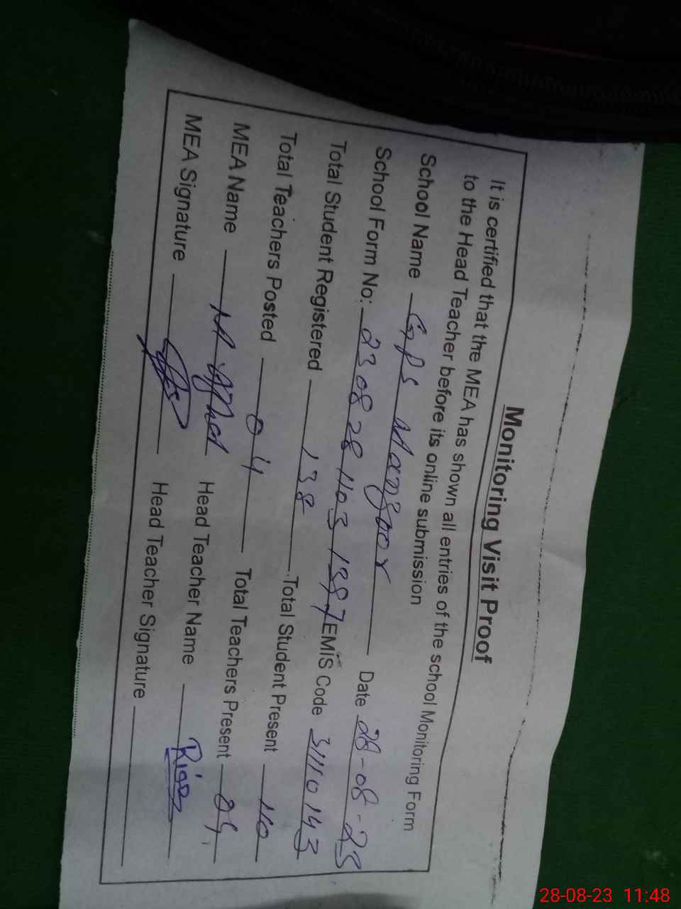 | Attendance Register | Head Teacher | MEA with School | Visit Proof |
