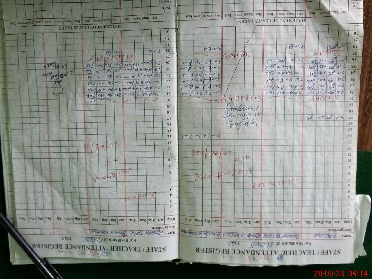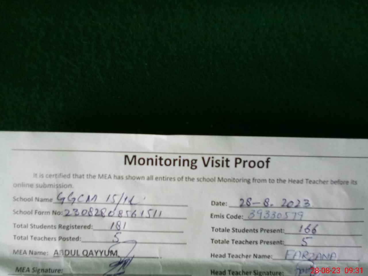 | Attendance Register | Head Teacher | MEA with School | Visit Proof |