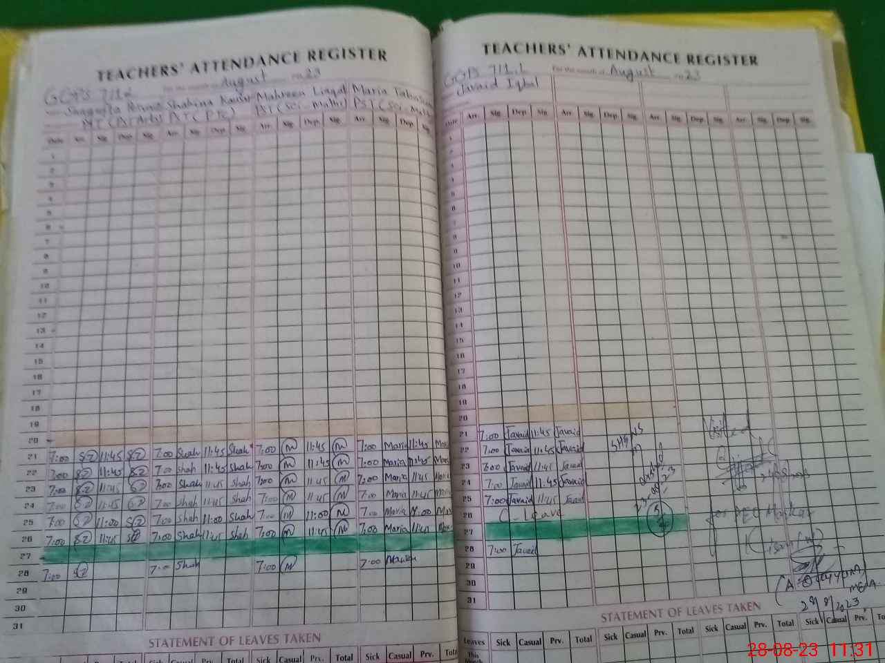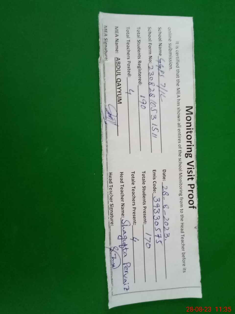 | Attendance Register | Head Teacher | MEA with School | Visit Proof |