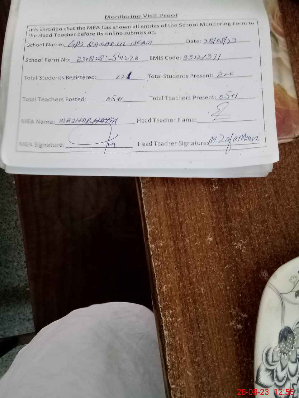 | Attendance Register | Head Teacher | MEA with School | Visit Proof |