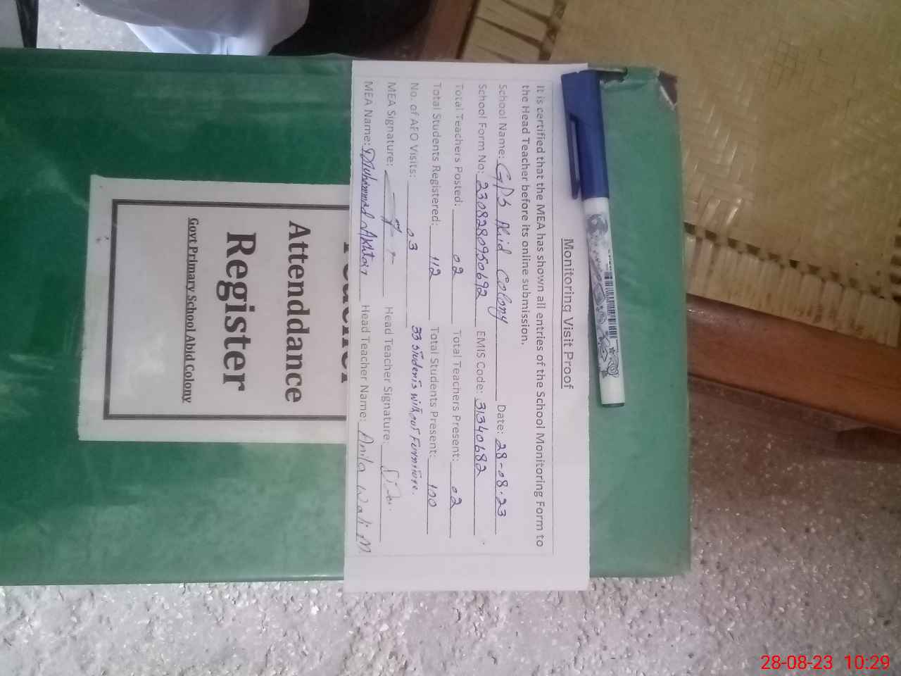 | Attendance Register | Head Teacher | MEA with School | Visit Proof |