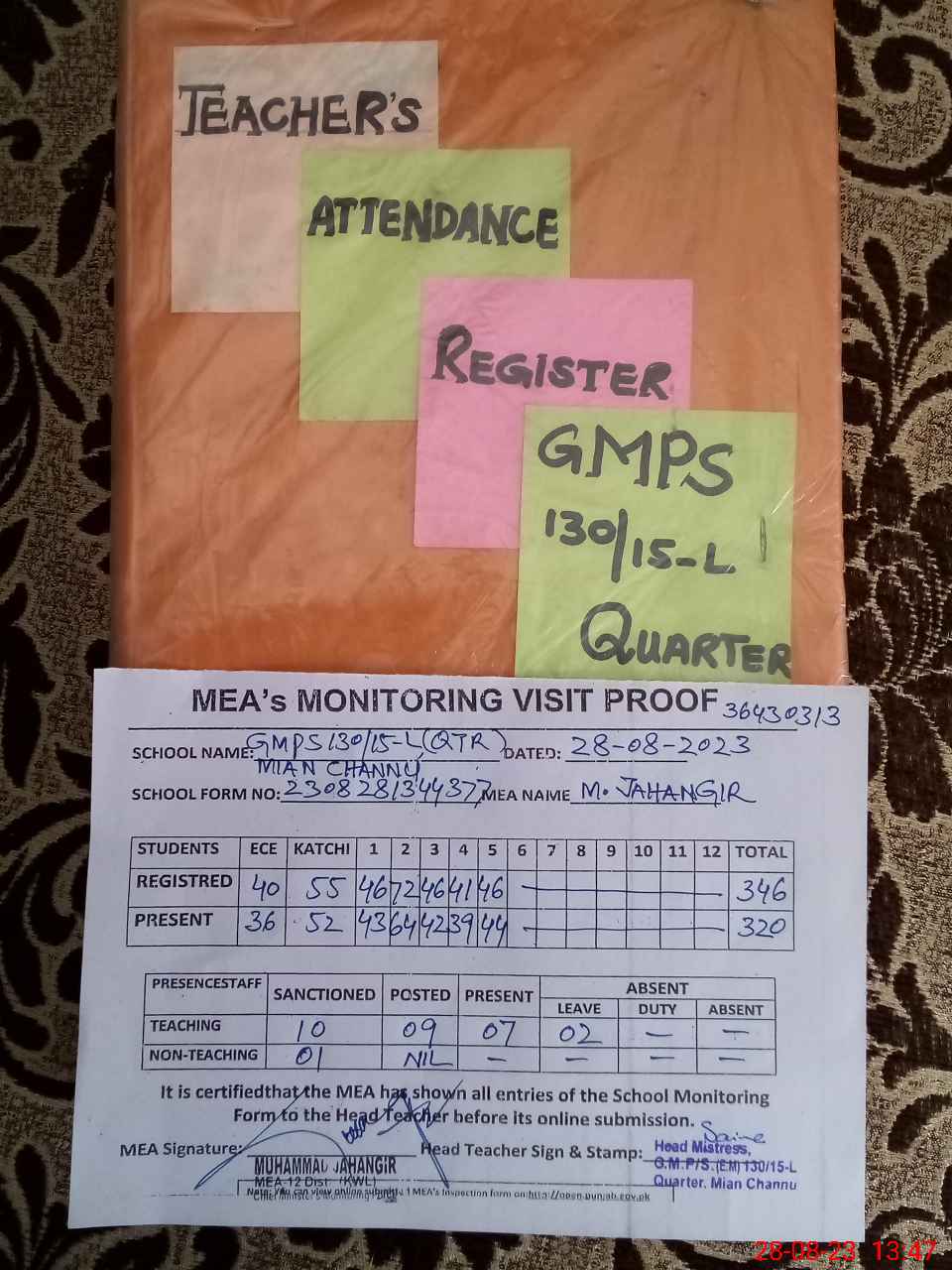 | Attendance Register | Head Teacher | MEA with School | Visit Proof |