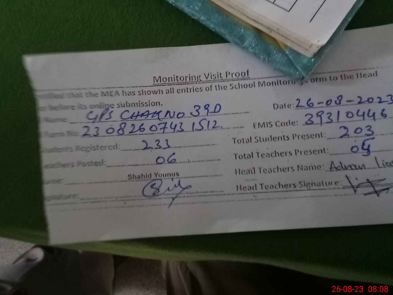 | Attendance Register | Head Teacher | MEA with School | Visit Proof |