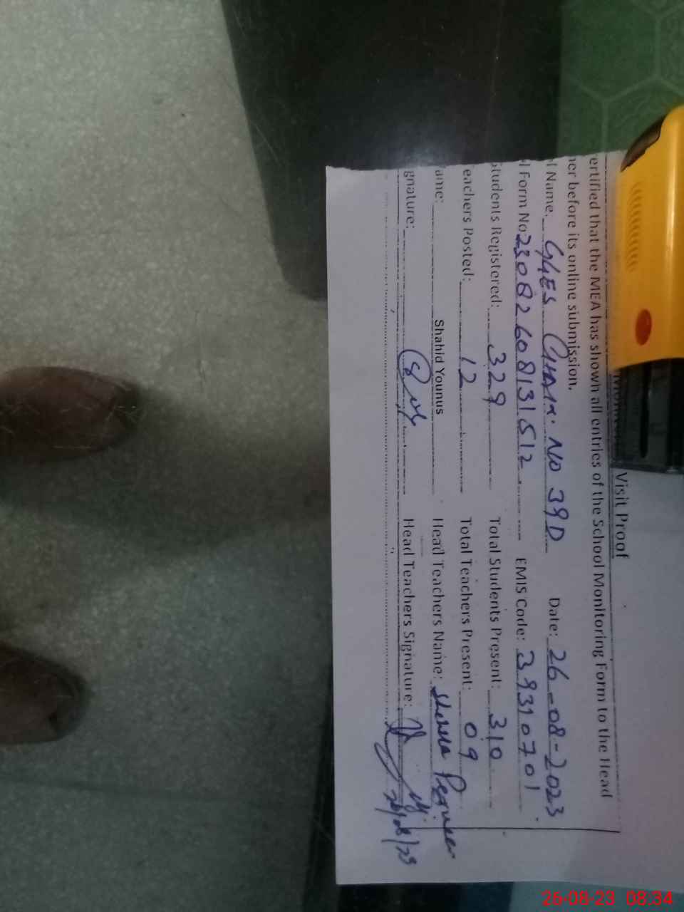 | Name: SH**** PE**** Designation: (School Headmaster's/Headmistress's) SSE Phone/Cell Number: 03**** |