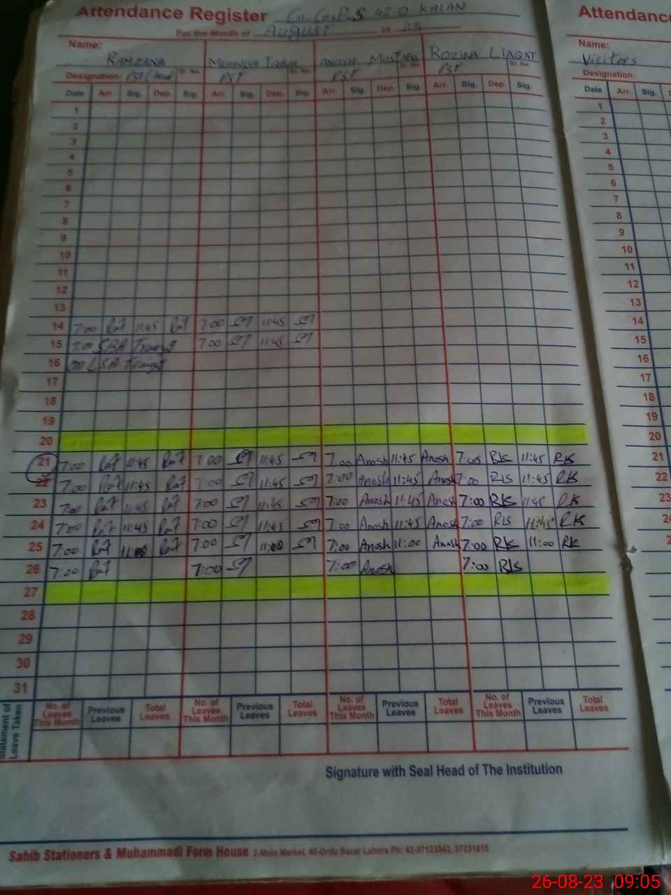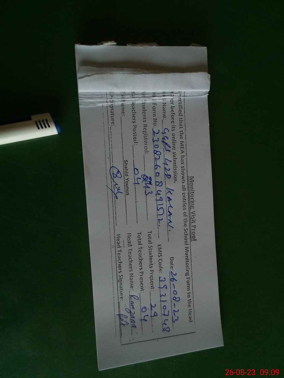 | Attendance Register | Head Teacher | MEA with School | Visit Proof |
