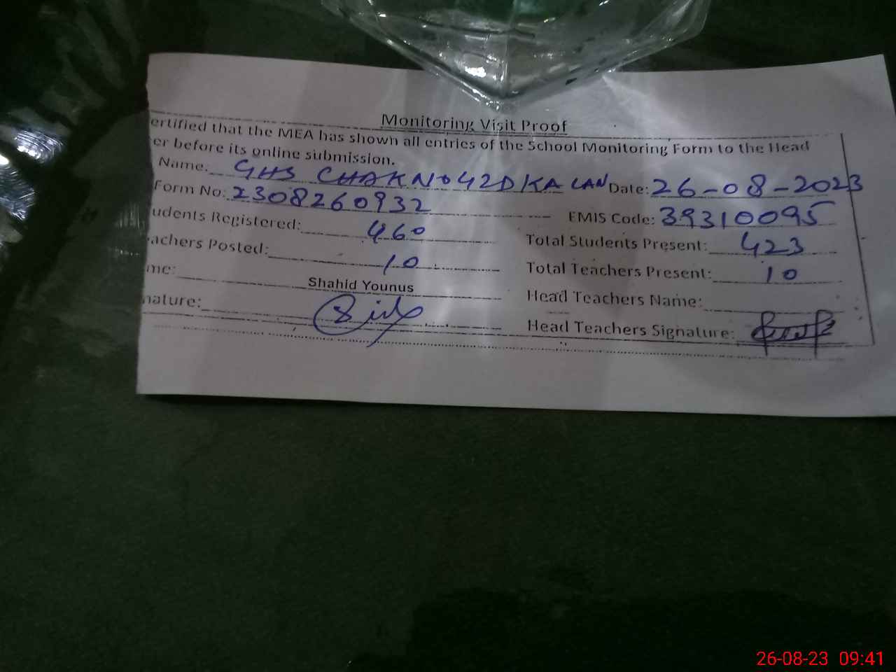 | Attendance Register | Head Teacher | MEA with School | Visit Proof |