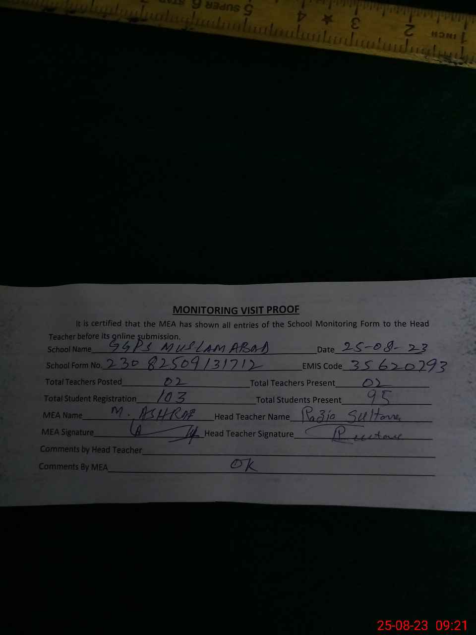 | Attendance Register | Head Teacher | MEA with School | Visit Proof |