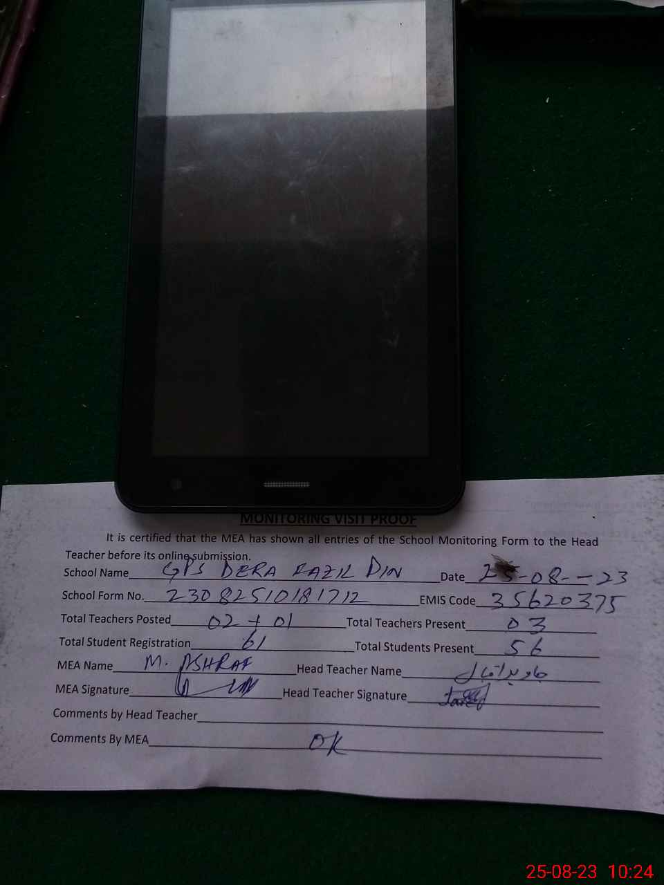 | Attendance Register | Head Teacher | MEA with School | Visit Proof |
