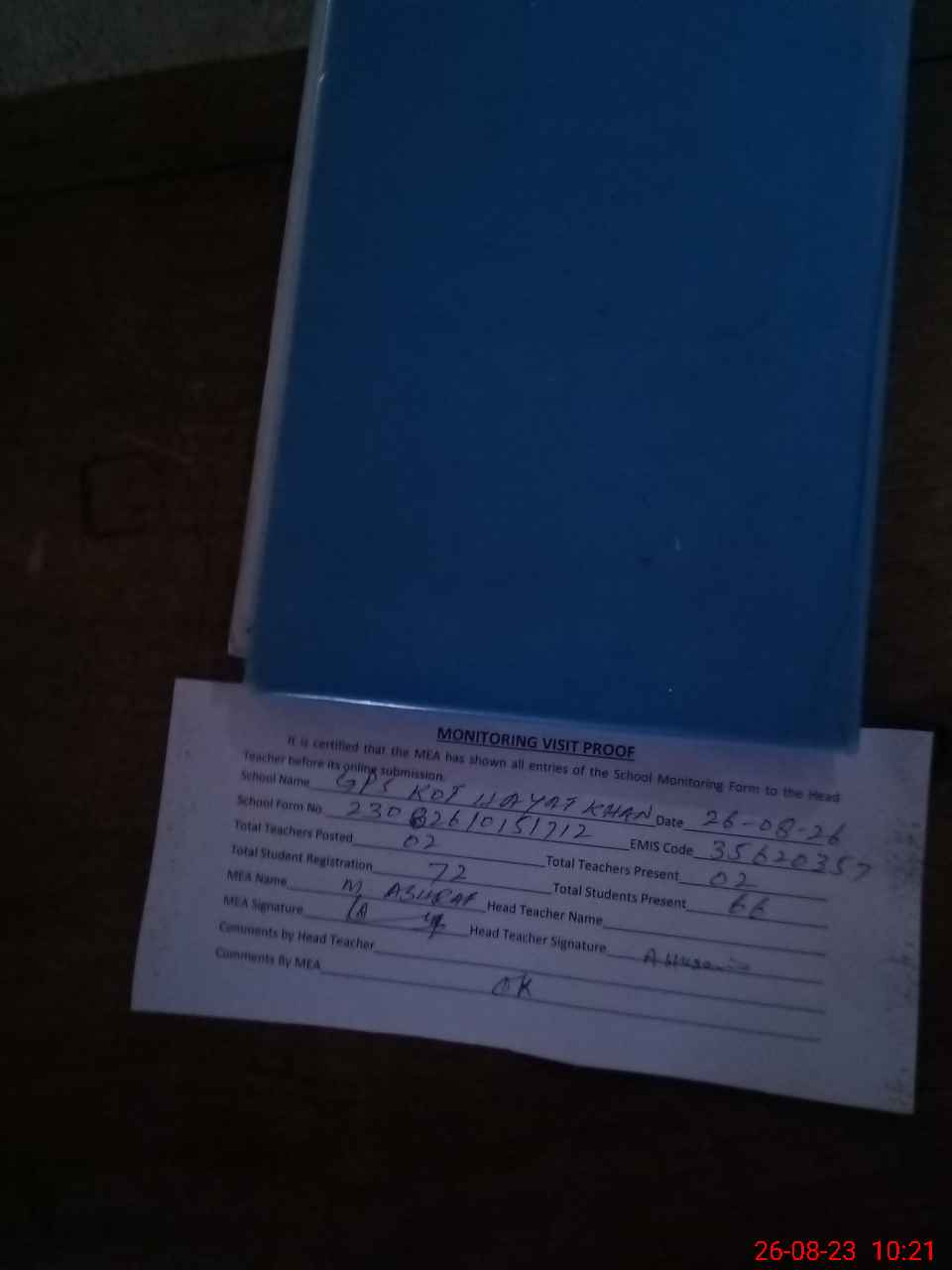 | Attendance Register | Head Teacher | MEA with School | Visit Proof |