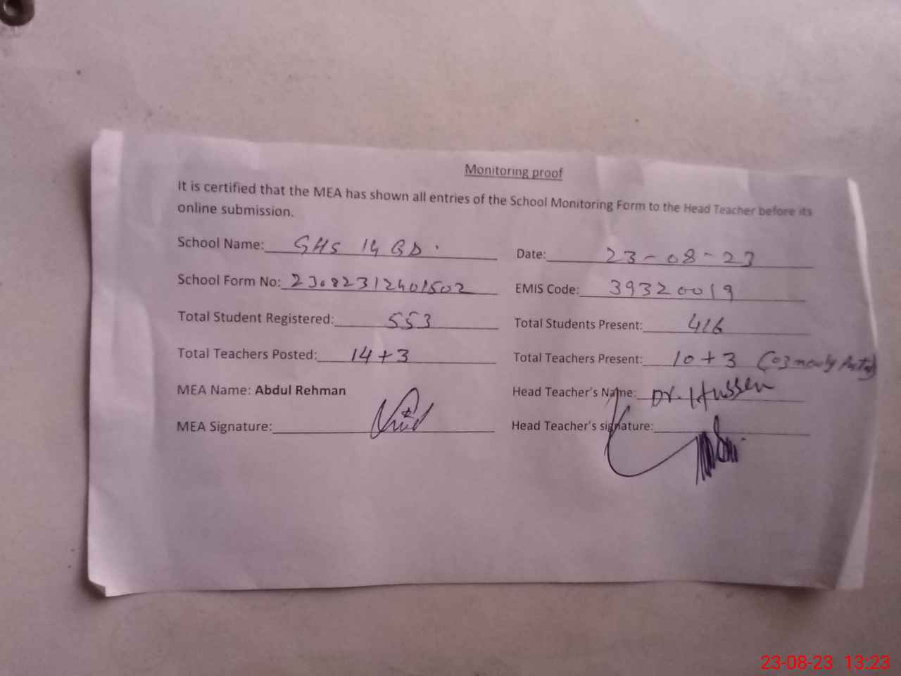 | Remarks (Use Separate Page if Required): Tahir ese Ghulam murtaza est and Zohray khan est are posted in on 17 August 2023 in this school found present | |||||