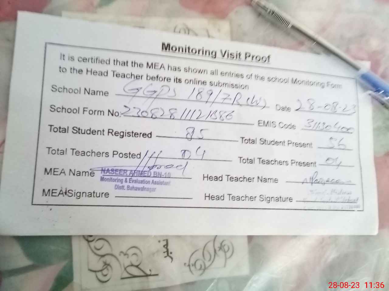 | Attendance Register | Head Teacher | MEA with School | Visit Proof |