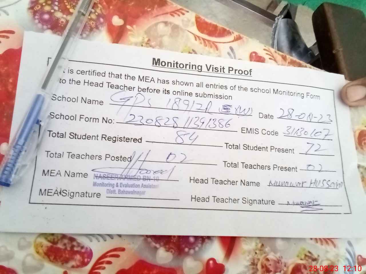 | Attendance Register | Head Teacher | MEA with School | Visit Proof |