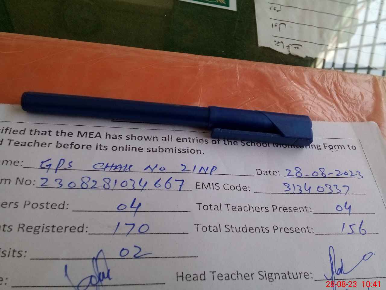 | Attendance Register | Head Teacher | MEA with School | Visit Proof |