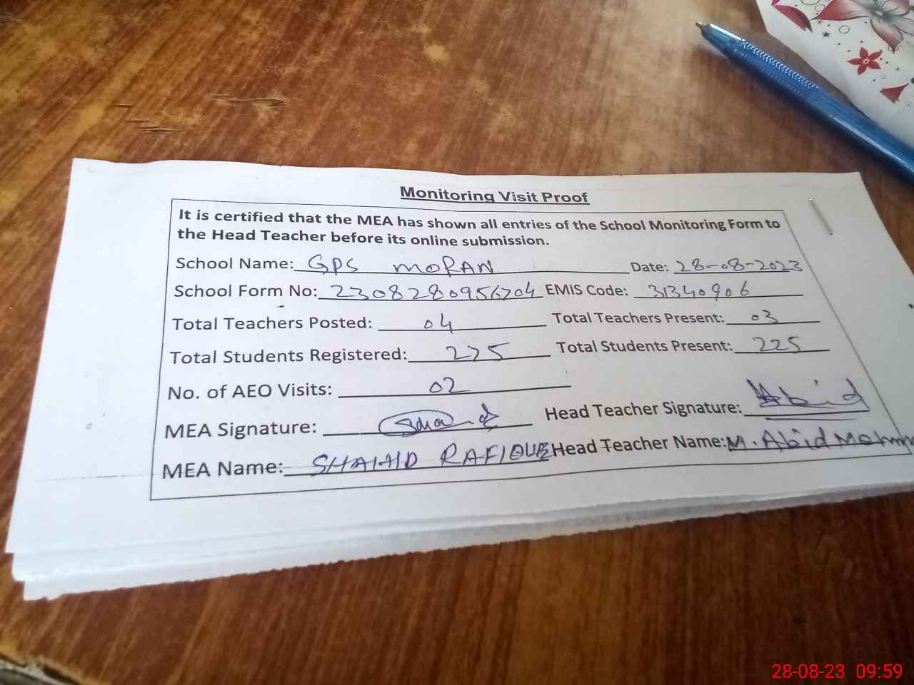 | Attendance Register | Head Teacher | MEA with School | Visit Proof |