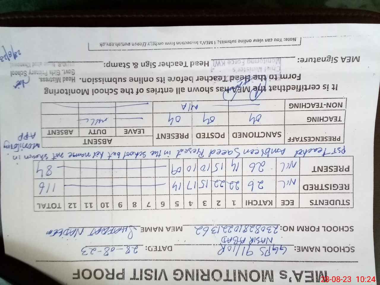 | Attendance Register | Head Teacher | MEA with School | Visit Proof |