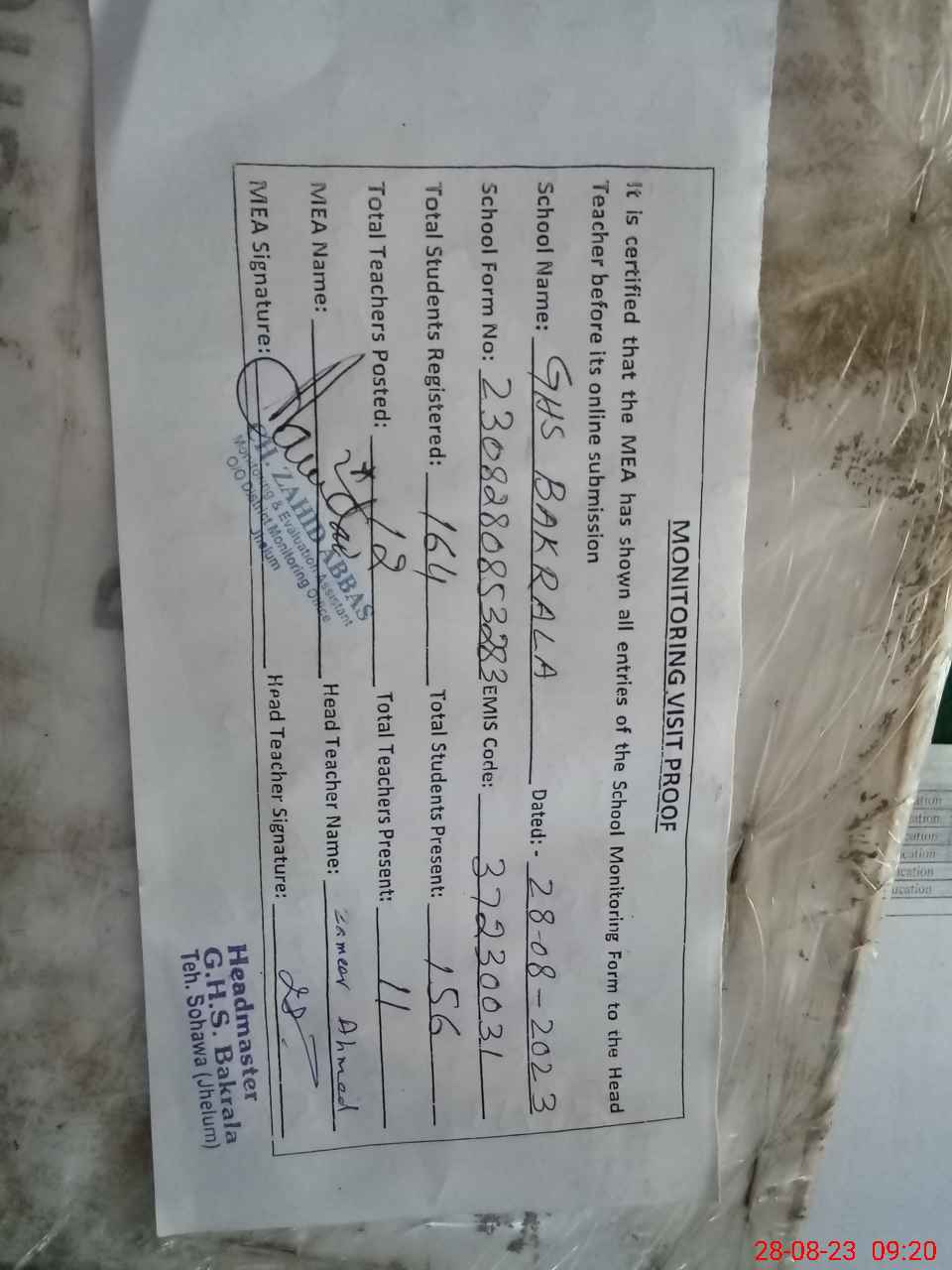 | Attendance Register | Head Teacher | MEA with School | Visit Proof |