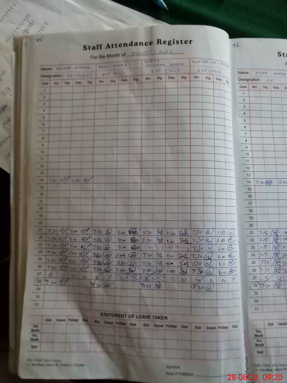 | Monitoring Date: 28-08-2023 | Start Time: 28-08-2023 08:53 AM | End Time: 28-08-2023 09:30 AM | Name of MEA: Za**** Ab**** | |