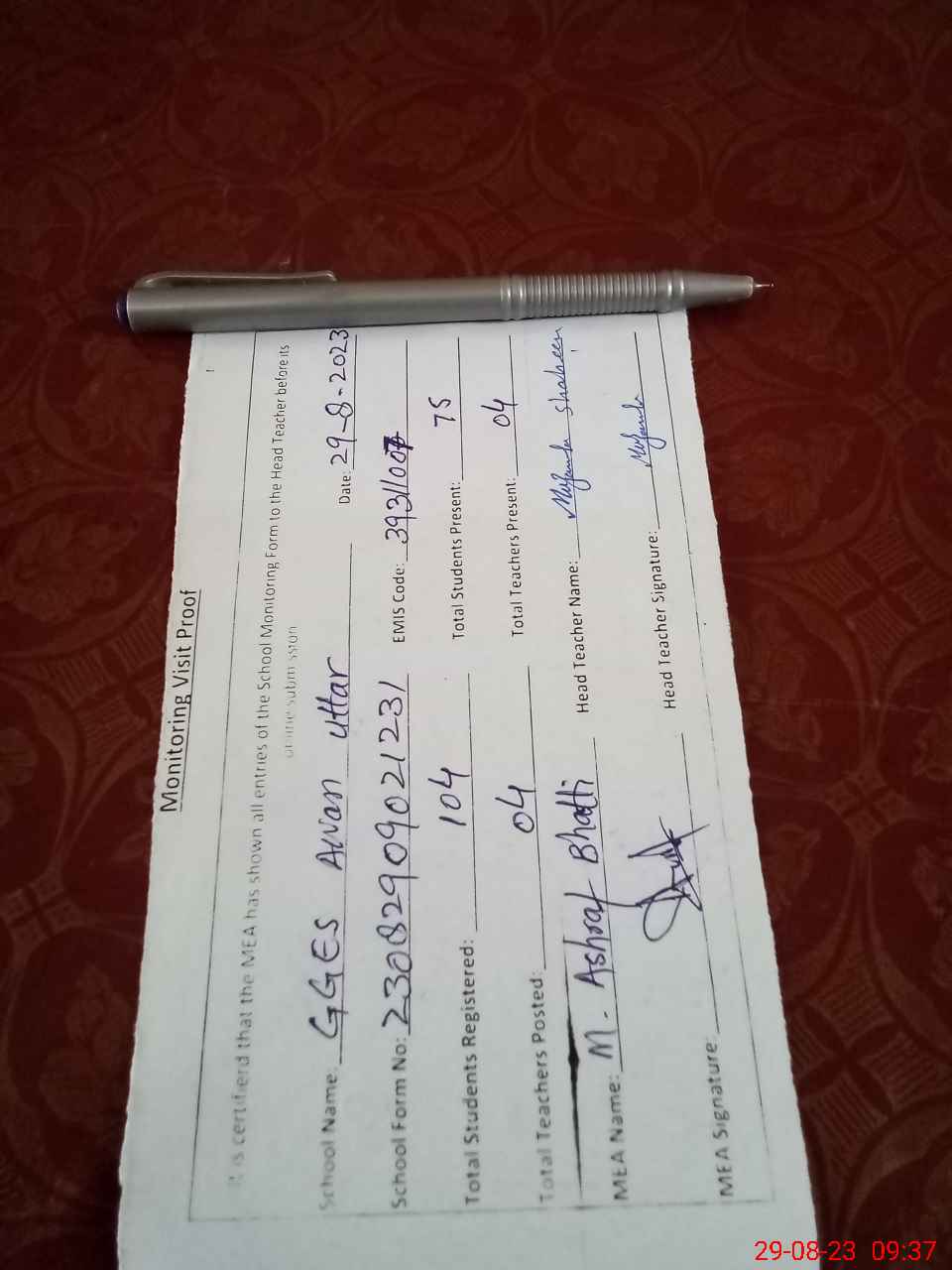 | Attendance Register | Head Teacher | MEA with School | Visit Proof |