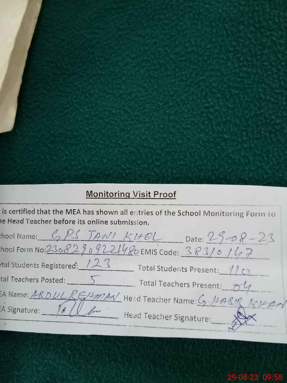 | Attendance Register | Head Teacher | MEA with School | Visit Proof |