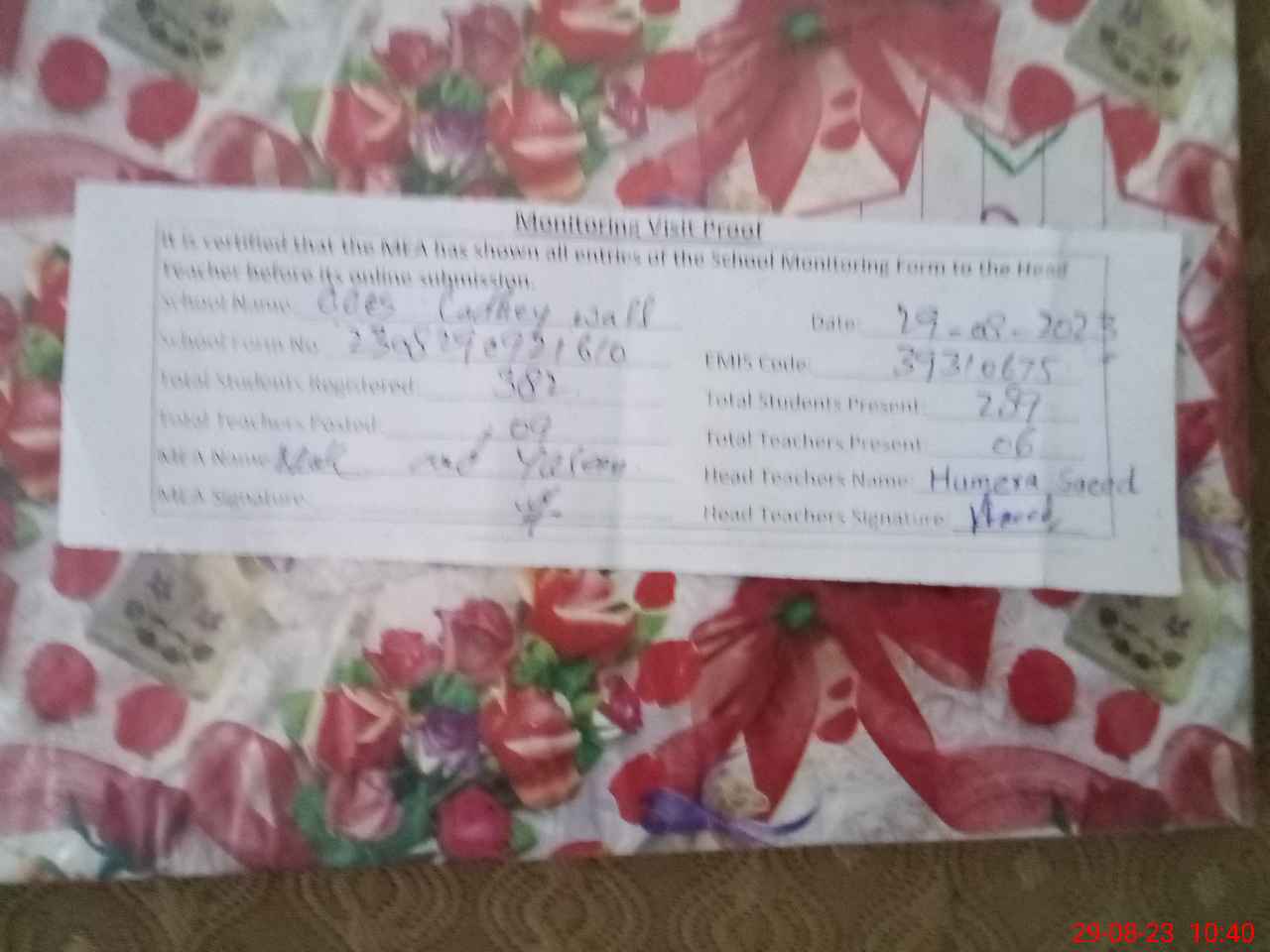 | Attendance Register | Head Teacher | MEA with School | Visit Proof |