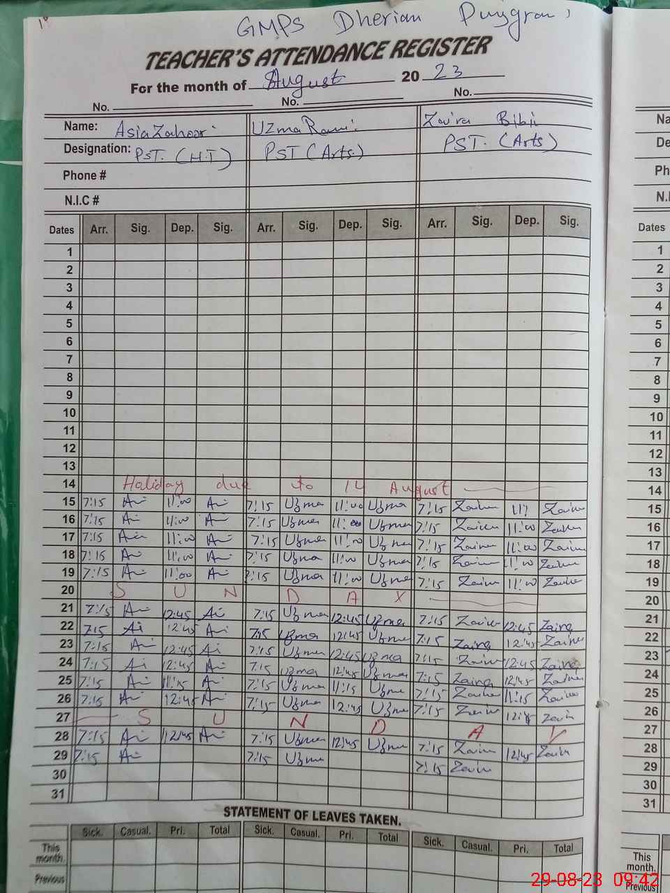 | CNIC | Full Name | Designation | R/C | Absence During Last Calender Month |