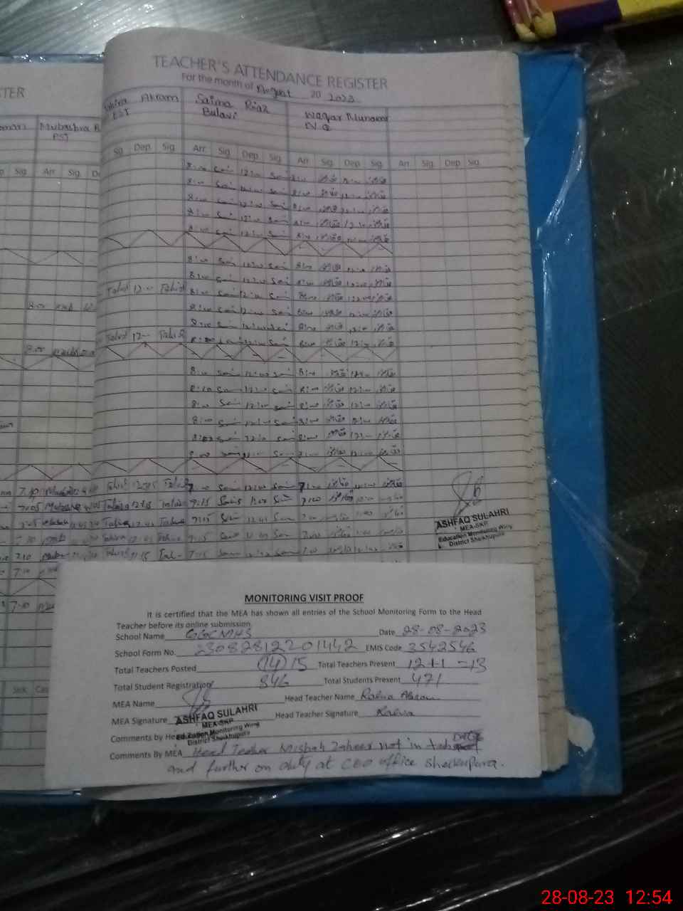 | Attendance Register | Head Teacher | MEA with School | Visit Proof |